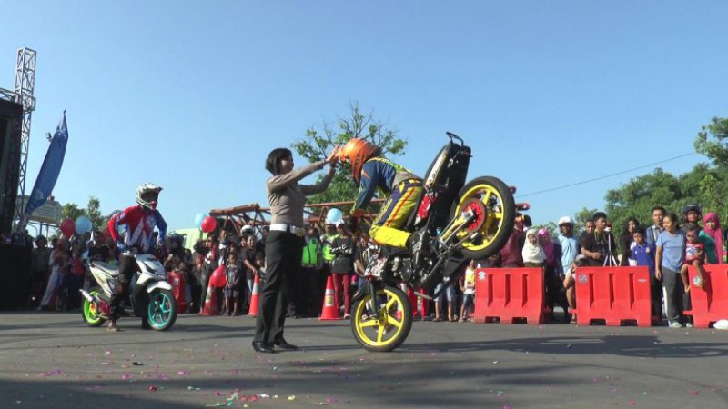 Acara pencanangan tahun keselamatan dimeriahkan oleh aksi pemotor free stlyle yang menegangkan dan aksi polisi cilik yang menggemaskan. Dua pengendara motor free style lincah mengendalikan kendaraan menggunakan perangkat standar keselamatan, salah satunya helm. Keduanya mengitari seorang polwan yang berdiri dengan putaran kencang.