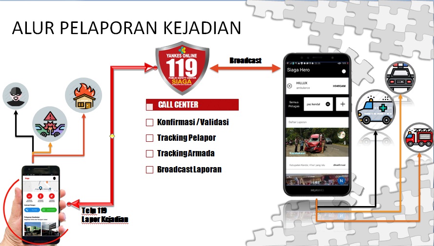 Bisa tuh melaporkan pencurian, Kebakaran, orang mau melahirkan, Kecelakaan atau ada orang terkena gangguan kesehatan yang membahayakan seperti serangan jantung atau stroke.
