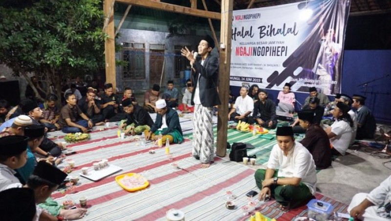 Musik akustik rock dan reggae meramaikan acara Halal Bi Halal KomunitasNgaji Ngopi Hepi (NNH) yang digelar di halaman Warung Sate Sari Nikmat Kaliwungu, Senin (24/6/2019) malam. Tampilnya grup musik anak-anak muda itu mengingatkan Walisongo dalam berdakwah menyebarkan agama Islam.