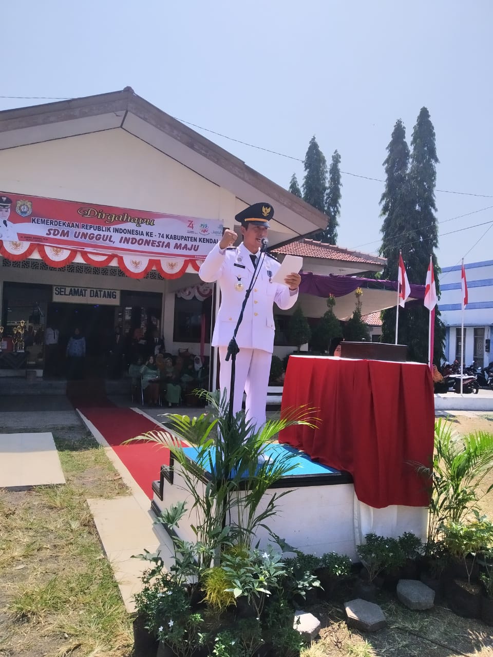 Pada upacara HUT RI ke 74 inspektur upacara adalah Camat Kaliwungu Bpk. Achmad Ircham Chalid, S.STP. MH, untuk komandan upacara dan komandan Pleton adalah Ramil Kecamatan Kaliwungu. Pembaca Doa adalah dari KUA Kecamatan Kaliwungu.