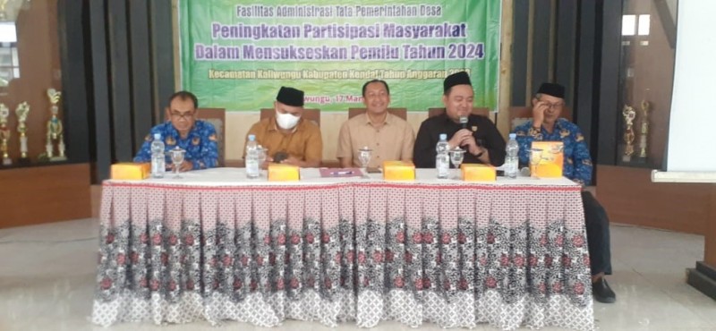 Tingkat partisipasi pemilih d Indonesia secara kuantitaif sudah cukup baik, hal ini dibuktikan dalam Pemilu Serentak Tahun 2019 yang mencapai 81,9%. Partisipasi ini hendaknya dapat ditingkatkan pada Pemilu serentak 2024 baik kuantitatif maupun kualitatif, artinya partisipasi yang berkualitas yang ditandai dengan : Pemberantasan politik uang, peningkatan kualitas kampanye, pemberantasan HOAKS, penegakan hukum terhadap pelanggaran pemilu/pilkada, Hal tersebut dissmapaikan Sekcam Kaliwungu, selaku narasumber Sosialisasi Partisipasi Masyarakat Dalam pemilu yang digelar pada hari, Jum’at, 17 Maret 2024 di Pendopo Kec. Kaliwungu.